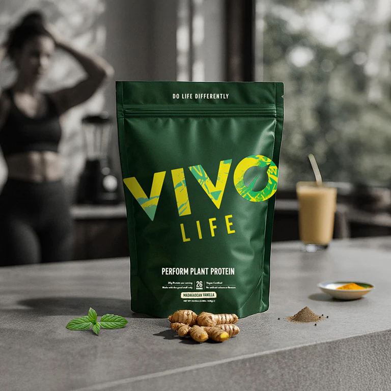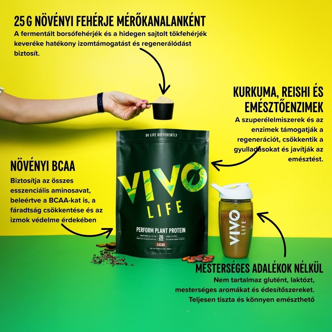 Vivo Life PERFORM vegán fehérje hozzáadott BCAA-val, kurkumával és gyógynövényes emésztőenzimekkel a jobb emészthetőség és felszívódás érdekében. Mesterséges színezékek és édesítőszerek nélkül.